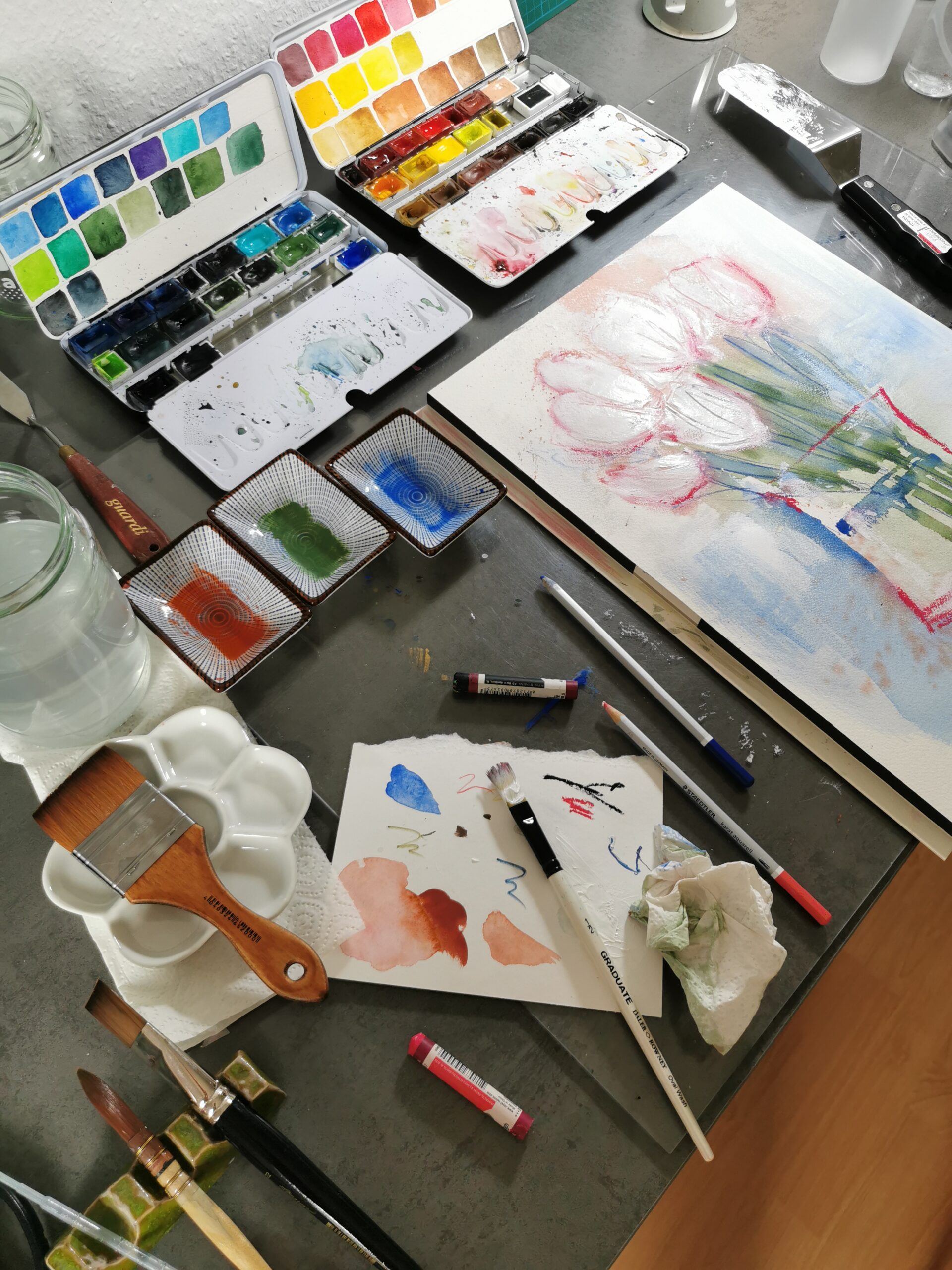 Mehr Platz wäre schön, aber im Moment reicht es so. Eigentlich ist mein Atelier in meinem Kopf. Hier gibt es keine Grenzen und unendlich viel Platz. Bevor ich anfange ein Bild zu malen, ist es längst in meinen Gedanken entstanden. Die Eckpfeiler wie Motiv, Farben und die Vorgehensweise sind oft vorher schon geplant. Der Rest, der Zauber des Schaffens und die Freude die ich dabei empfinde, die Prise Zufall und Glück passieren dann auf dem Papier.