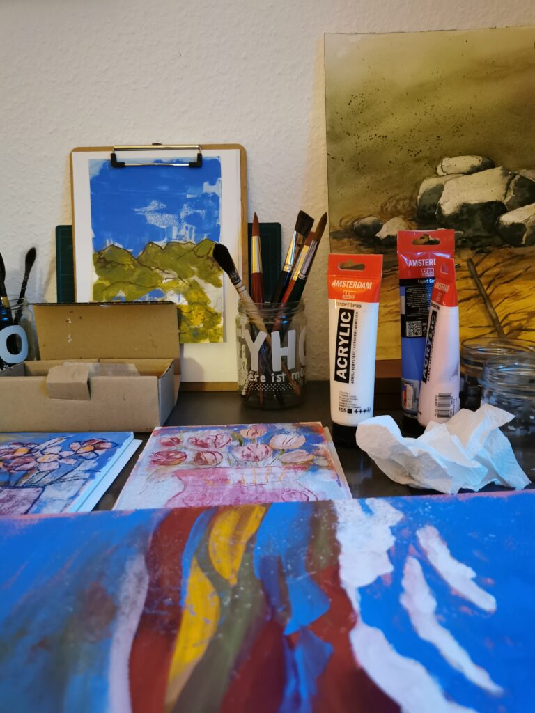 In meinem Zuhause ist es trubelig und bunt. Es gibt keinen freien Raum und keine stille Nische. Im Wohnzimmer steht mein Schreibtisch, auf dem ich arbeite. Alles ist in Griffweite, Pinsel, Farben und Papier. Auf engem Raum ist alles da.